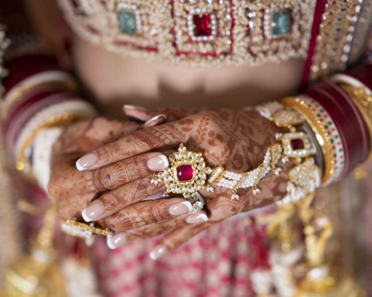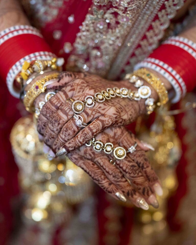 Indian bridal jewellery represents remarkable craftsmanship deserving dedicated documentation. Our wedding detail photography captures maang tikkas, passa, nath, jhumkas, necklaces, choker sets, bangles, rings, and kamarbandhs through macro close-ups, revealing intricate metalwork, precious stones, and design artistry. These images become heirlooms themselves, documenting jewellery potentially passed through generations.